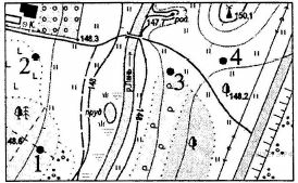 Туристы устроили привал на границе редкого леса и луга. Место привала на плане местности отмечено точкой с цифрой: