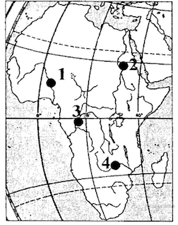 Установите соответствие между географическими объектами и их местонахождением, обозначенным на карте цифрой, и разместите последовательно в направлении с запада на восток от нулевого (Гринвичского) меридиана.