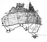 Тип климата Австралии, для которого характерно господство в течение года жарких и сухих тропических воздушных масс с суточными амплитудами, достигающими 40 °C, формируется в пределах территории, отмеченной на карте точкой с цифрой: