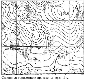 Определите на фрагменте топографической карты относительную высоту (в метрах) отмеченной на карте точки с буквой по отношению к отметке уреза воды в озере Глухое.