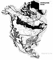 Установите соответствие между природными зонами, отмеченными на карте цветом и буквами, и их характеристиками:
